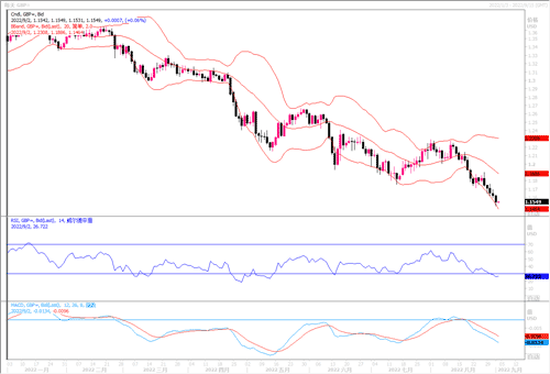 英镑兑美元周四跌至2020年3月以来的最低水平1.1500。在全球货币兑美元大幅下跌之际,英镑更是难逃一跌。这主要是:通胀压力、经济疲软和新首相政策的不确定性等因素的结合使得英镑显得特别脆弱。日图受下行均线打压进一步刷新低点,仍维持弱势。4小时图下行动能维持完好,仍看跌。支撑位:1.1500 1.1450 1.1400,阻力位:1.1600 1.1630 1.1650。