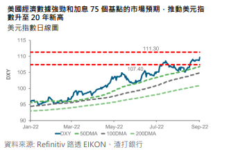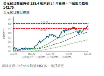 制造业数据有韧性,同时显示价格压力下降、申领失业救济人数减少,以及美联储委员的鹰派言论,都推升美元指数(DXY)突破年初以来高位 109.3,来到 20 年来新高。虽然上行趋势看似强劲,但美元已经处於超买状态,要突破下个阻力位 111.3 或遇到一定难度。美元兑日圆飙升至 140之上创 24 年来新高。美日央行政策分歧是今年日圆疲弱的关键驱动因素,除非任何一间央行的政策立场有所变化,否则相信难以逆转如此趋势。近期日圆走弱可能增加市场对日本官方会否进行干预的猜测。美元兑日圆上方阻力料在 142.75 和 144 附近。由於美元兑多数货币普遍走强,以及成都封锁後市场再度忧虑中国对大宗商品的需求,利淡澳元兑美元下跌。由於澳洲央行可能仅加息 50 个基点,市场或会关注澳元兑美元能否守住 0.6680 的关键支持。