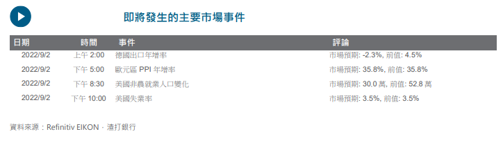 美国 10 年期国债利率上升 7 个基点至 3.26%,与政策敏感的 2 年期国债利率升破 3.5%,反映投资者在经济指标优於预期下对美联储加息态度更加鹰派的预期,即使越来越多迹象显示通胀可能正在见顶。ISM制造业指数优於预期,整体持平在 52.8,具前瞻性的新订单数据反弹至 51.3、扭转连续 2 个月的跌势。在通胀层面,ISM 价格指数跌幅超预期,从 7 月份 60.0 降至 52.5,美国第二季单位劳动力成本从最初报告的 10.8%和第一季的 12.7%下修至 10.2%.整体而言,数据反映即将发生衰退的可能性并不大,但我们仍将焦点放在今晚将公布的就业数据之上。中国 8 月份制造业数据收缩,在成都维持封锁状态以及防疫限制措施持续下,8 月份财新 PMI 从 7 月份的 50.4 回落至 49.5.
