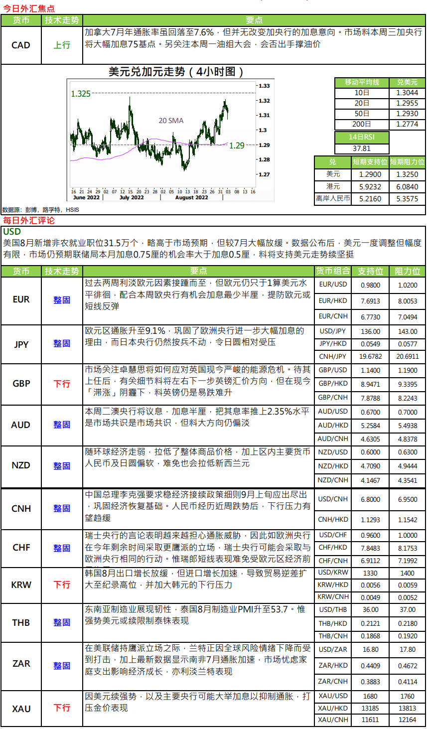 · 本周市场要留意的因素众多,单是今天(5 日) ,英国保守党将公布新党魁人选。而这位党魁亦将自然成为英国的新首相。而市场普遍相信在今次党魁之争中,如无意外卓慧思将会胜出。她上任后首要处理是现时英国所面对的「滞涨」问题,即面对高通胀率同时,经济走弱。而她曾透露过会以减税形式舒缓市民的电费压力,但具体方案如何待其上任后油组将必须交代。另外同为今天,油组将开大会。面对油价(纽约期油)跌破 90 美元水平,沙特阿拉伯上周已不断暗示要减产应对。油组会否支持今天将自有分晓· 本周有数间央行议息。周二有澳央行,市场估计将加息半厘。周三有加央行,市场同为估计将加息半厘。而周四则有欧央行。面对欧洲通胀率大幅攀上 9.1%水平,市场估计本周欧央行将最少加息半厘,甚至有机会加息 75 基点。但是,由于俄罗斯于过去周末宣布暂停「北溪一号」管道的天然气供应,这或会影响本周欧央行的加息决定· 经济数字方面,本周重点多落在内地身上。本周三及周五,内地将分别公布 8 月贸易收支及 8 月生产物价指数数字。该两数字相信均能反映内地经济的最新状况。受疫情反复所影响,中国内部经济已见转弱,推动经济更需依赖出口支撑。所以贸易数字将变得重要。至于通胀,是现今环球最关心的环节,中国作为生产大国,相信大家也关注其生产物价
