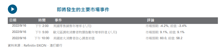 对政策敏感的两年期国债息率昨晚进一步上升8个基点至3.86%的多年新高。投资者静待下周FOMC会议利率决议,美国2年与30年国债孳息曲线倒挂创过去几十年来最深程度。美国初领失业救济人数结果优於预期,从上周22.2万人降至21.3万人,为连续第五周下降。当地劳动市场仍然强劲,料会让美联储在下周继续其紧缩政策。另外,纽约州制造业指数由上月-31.3大幅提升至9月的1.5,而8月零售销售在7月下跌後亦意外回升0.3%.消费者对商品需求维持稳定,但在通胀创历史高位下有放缓迹象。欧元区今天将公布核心通胀,普遍预测为4.3%.