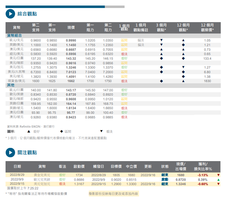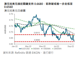 由於对全球经济衰退的担忧加剧、商品价格下跌和美债息率上升,利淡澳元下跌。澳元兑美元正向今年低位0.6680迈进,若跌破该水平将使短线前景转为看淡,後市汇价支持位料在於0.6560.人民币疲弱也令澳元受压,美元兑人民币亦升破7.00的关键阻力。人民币疲弱可能会对其他新兴市场货币产生负面影响,并可能让人民银行采取更积极的行动来遏制人民币进一步疲弱。黄金跌破关键支持1680後或进一步下行,目前支持位在於1625.由於中性价位已被突破,我们结束看好黄金兑美元观点。由於美元兑加元升穿1.3220的阻力位,我们亦结束了看淡美元兑加元的观点,意味着美元兑加元有进一步上升的风险。