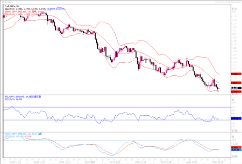 英镑兑美元上周五盘中曾跌至37年新低至1.1351,为1985年以来的最低点。当日,英国国家统计局公布,8月零售销售按月下降1.6%--为2021年12月以来最大跌幅,而且比路透调查中所有分析师的预测值都要糟糕,该调查原预计零售销售将下降0.5%。这只是英国经济最新的坏消息,国际货币基金组织(IMF)预测,英国明年将面临比其他任何主要经济体更慢的经济增长和更持久的通胀。这一切折磨人的背景正在给英镑造成压力,英国目前外部赤字规模巨大,且围绕新首相政策的风险也在增加。最近几个月,大多数主要货币兑美元一直走势挣扎,而上周美国通胀数据超过预期,推动市场预期美联储本周将进一步大幅加息,为美元上涨再添动力。在种种不利的大环境下,英镑似乎变得越来越虚弱不堪。短线英镑进行着超跌反弹整理中,但日线图上汇价整体仍受压于短期均线下方,显示英镑的下行走势未有歇止的味道,只是技术指标超卖并有钝化迹象,须小心防范超跌后反弹整理向上走的风险。上方初步阻力在1.15,随之在1.16。下方则留意上周五到过的低位1.1351,若跌破下方将继续探低。