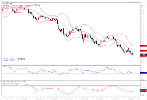 周二(9月20日)受挫的英镑继续下跌0.5%,至1.1358美元。根据路孚特的数据,货币市场认为英国央行周四加息50个基点的可能性为百分之百,加息75个基点的可能性约为75%。尽管专业机构都普遍认定英国央行本周将继续加息,但是其风头始终是被美联储的加息举动遮盖住,投资者的目光始终主要聚焦在美联储的态度和举动上。从总体来看,尽管空头暂时占优,但下方支撑继续保持,短线预防技术性修正,从4小时图来看,布林上下轨略有收窄,MACD零轴下方运行,日内下方首要支撑1.1350,第二支撑1.1300,上方阻力1.1470,1.1520。若第二支撑跌穿,英镑将延续颓势继续创低。同时也需要留意有无卖消息买事实的技术性交易行情的出现。