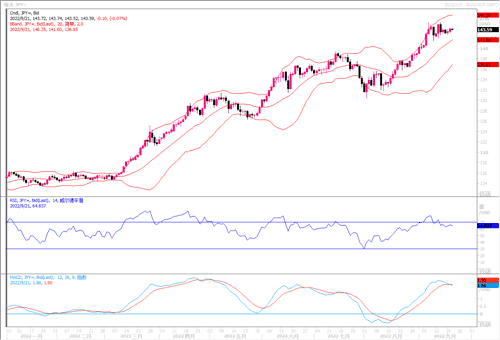 日本央行本周也将召开会议,但普遍预计将维持其超宽松刺激政策--包括将10年期公债 收益率固定在零附近--以支持脆弱的经济复苏。由于这一政策,日元今年已经暴跌,美元兑日元周二尾盘上涨0.4%,报143.78日元。在9月7 日攀升至144.99日元的24年高点后长达一周的盘整走势仍在继续。日线图上,目前美元兑日元仍在布林带上轨高位盘整之中,但RSI技术指标有顶背离现象,MACD开始有形成死叉迹象,还是要慎防美日高位遇阻进行下落回调的风险。日内上方首要阻力143.30-40,第二阻力143.70,下方支撑依次为142.25,141.50。