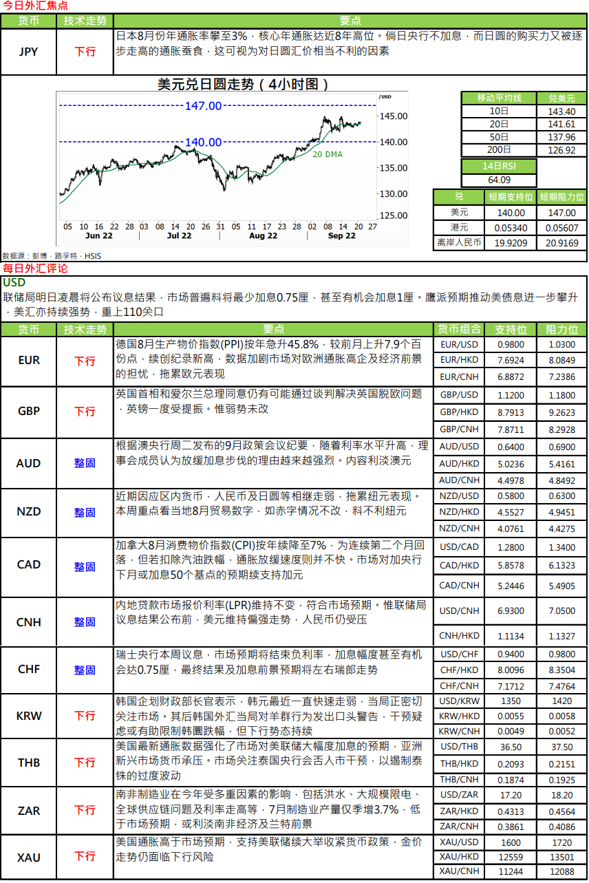 恒生银行:今日外汇黄金市场评论及操作建议(2022年9月21日)