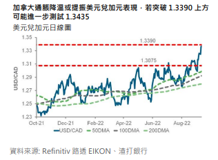 美元指数上升至接近20年高位,因投资者预计美联储将在今晚的政策会议後重申其鹰派展望。美元年初至今已上升约15%,有望创下41年来最大的按年升幅。英镑兑美元跌破关键支持位1.14至新的37年低位,短期技术走势转为看淡。若持续跌破1.14可能会迈向下一个目标1.1145,接着是1.10.英伦银行将於周四议息,市场认为可能加息50或75个基点。尽管加拿大央行发表鹰派言论,美元兑加元仍上升,该汇价正上望1.3390的阻力。加拿大通胀率从先前的按年7.6%下降至7.0%.但加拿大央行官员表示通胀仍远高於目标,而他们将采取一切必要措施来压抑物价。