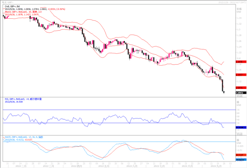 此前调查显示整个欧元区和英国的商业活动下滑速度加快,经济可能进入衰退期。同样对英镑构成压力的是,英国新任财政大臣夸滕宣布减税以及家庭和企业支持措施,政府债务办公室制定了本财政年度增发720亿英镑(797.4亿美元)以资助刺激措施的计划。英镑兑美元上周五(9月23日)触及1.0840美元的37年新低,创下两年来的最大周跌幅。英镑兑美元是当天最大跌幅最大的货币,下跌3.4%,报1.0874美元,这也是两年来最大的单日百分比跌幅。英国央行上周四将利率提高了50个基点,试图解决通胀问题,但与最近几个月的前几次加息一样,此举未能支持英镑,因为它被对经济的担忧所掩盖。除美元指数在美联储如期加息75点并释放鹰派信号而大幅攀升并刷新20年高位是施压英镑下挫的主要原因外,对英国央行大幅加息的预期降温和对英国经济今年晚些时候将陷入衰退的担忧也对汇价构成了沉重的打压。目前在看空英镑情绪浓厚的氛围下,日线图上显示英镑下行态势加快,技术指标进一步向超卖区域延展。继续看英镑有进一步创历史低位趋向。