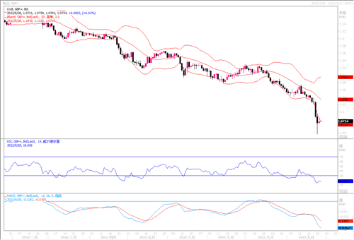 周二(9月27日)美元走势温和,欧元仍然接近前一天创下的20年低点。自上周以来,欧元一路下行,一度失守0.9600关口,现汇价仍处在近阶段的低点0.9600附近。除美元指数在多重利好因素的支撑下突破114.00关口并刷新20年高位是施压欧元下挫的主要原因外,欧元区表现疲软的经济数据也对汇价构成了一定的打压。不过,0.9600关口附近所形成的技术面买盘暂时限制了汇价的下跌空间。短线4小时图上的各类技术指标出现钝化,欧元的超卖味道较浓,日内还是要密切留意近期触碰过的低点0.9553的支撑,若撑持的住,或存在超跌反弹整理的机会。上方初步阻力0.9649,进而是0.9700。