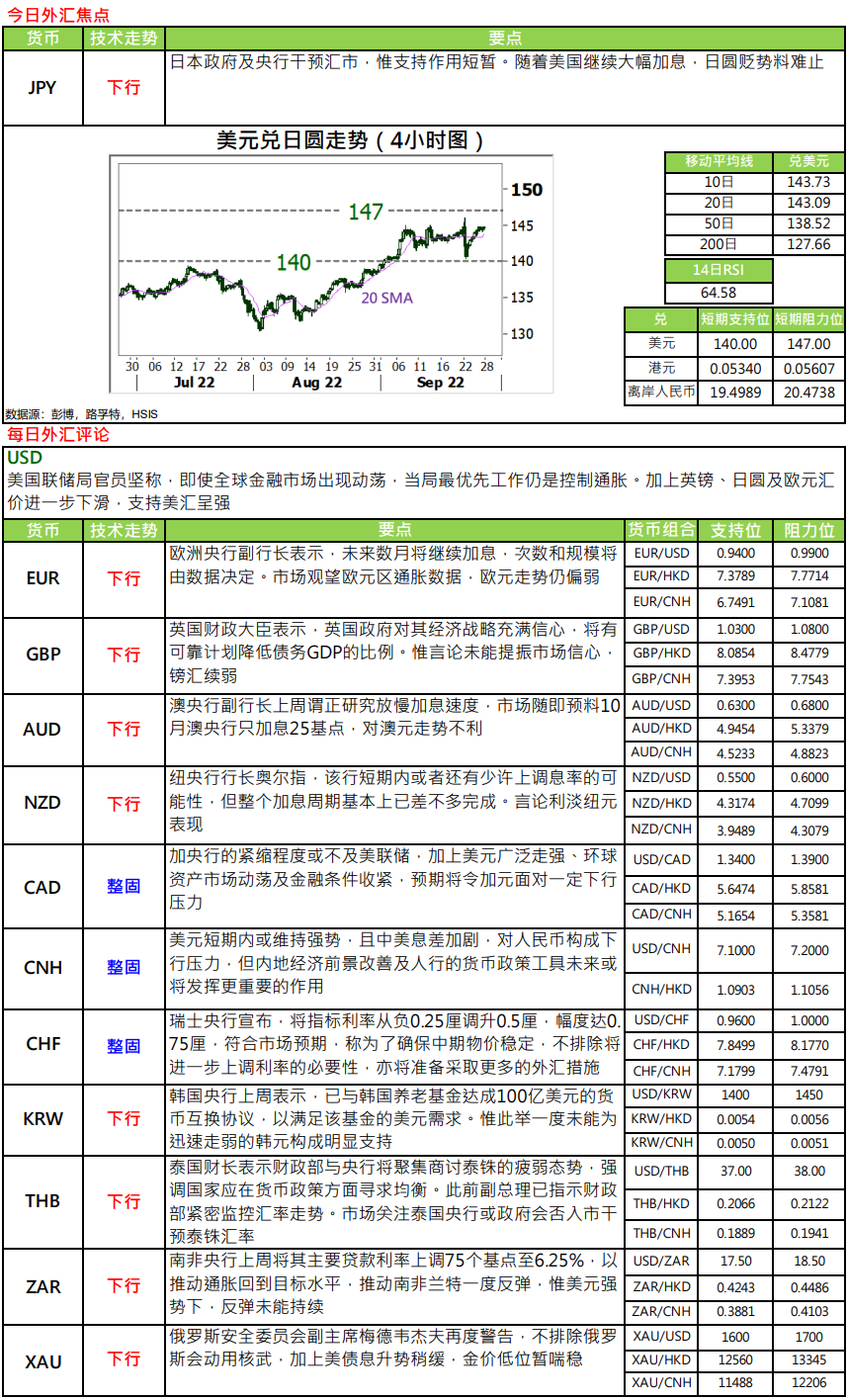 恒生银行:今日外汇黄金市场评论及操作建议(2022年9月28日)