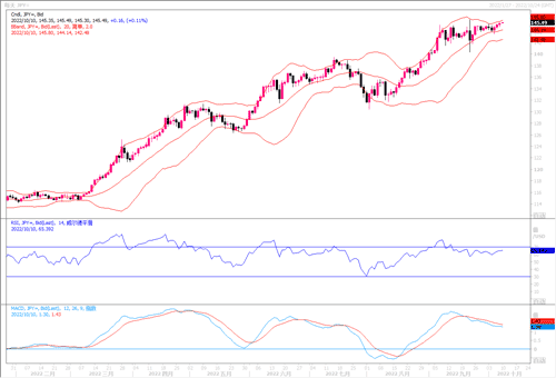 上周五美国公布强劲的非农数据后,美元兑日元继续上挺,截至本周一亚洲早盘阶段,美元兑日元穿透145报145.49。之前9月22日日本央行在该水位附近的干预效果渐渐失去,市场似乎认为从长期角度来看,日本央行将容忍日元的逐渐贬值,尤其是在日本外汇储备逐步下降的情况下。而日本央行所不愿看到的是所谓的日元不要出现单边快速大幅下跌情景出现。为此,预料交易员也会进一步逐步推低日元。日图仍在高位震荡,146为短期关键阻力,下方支持143.50。4小时图波动有限,缺乏方向。小时图温和走高,力度有限。技术指标整体呈震荡偏向上行态势。