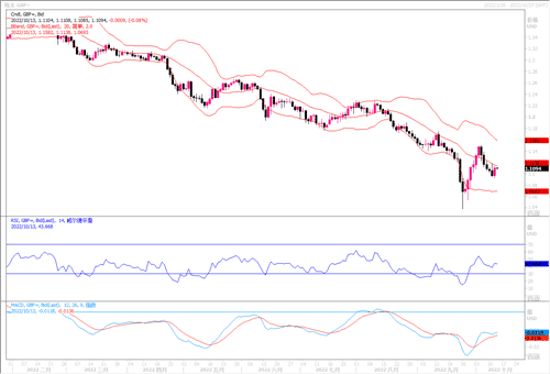 英镑周三走高,英镑兑美元上涨1.21%,重回至1.11上方,结束了连续五天的跌势。英国金融时报周三援引三位消息人士的话报导,英国央行已私下向银行暗示,如果市场条件需要,它准备延长周五将结束的紧急债券购买计划。英国央行行长贝利此前给出的是相背的意见,他公开告诉英国养老基金和其他受到债券价格暴跌打击的投资者,央行将按计划在周五结束紧急购债计划。英国央行内部这种不统一的意见,将会继续扰动着英镑的走势。日线图上,英镑此轮回落在1.09之上受到暂时的支撑,然汇价仍处于20日均线下方,暂时仍看不到能摆脱跌势的迹象。4小时图上,技术指标上扬,显示一定的多头动能,上方1.11的阻力较为关键,若上破,英镑兑美元有望延续反弹之路,若遇阻,则可能迫使英镑兑美元继续保持在整体的下降大通道内震荡下行。