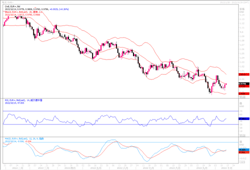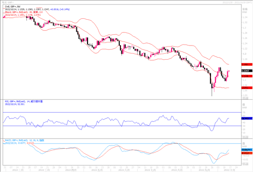 周四晚间的数据显示,美国9月消费者价格增长超过预期,核心通胀压力继续上升,消费者物价指数(CPI)在8月份上升0.1%后,上个月上升了0.4%。接受路透访查的经济学家曾预测CPI会攀升0.2%。在截至9月份的12个月中,CPI在8月份上涨8.3%之后,又上涨了8.2%。巩固了美联储将在下个月的政策会议上再次加息75个基点的预期。然而欧央行方面有管委委员发声,表示欧央行应大幅加息和缩表以应对不断飙升的通胀。为此,尽管隔夜美国通胀数据仍然高企,但兑美元刺激抬捧作用不显,美元指数倒是出现一定测高位回撤。欧元兑美元反而趁势反弹,当日录得0.77%升幅,盘中最高触及0.9808,收盘于0.9778。欧洲央行年内将在10月和12月还有两次议息会议,因此有先于美联储一手进行加息,利率期货市场预计本月欧央行极有可能会加息75个基点。息差的有望缩窄或在短期内能给予欧元一定的抬捧作用。日图在随机指标倾向在超卖区域交叉向上,汇价也尝试冲破布林带中轨(0.9820)的压制,如果能有效冲破布林带中轨的压制,则欧元有望进一步反弹,产生向平价回靠的欲望。若不过,则反弹冲高的希望落空。
