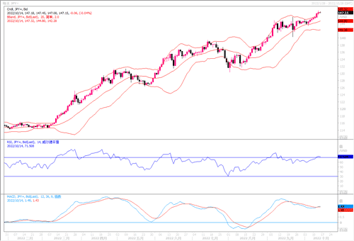 在美国公布超预期的通胀报告后,日元周四夜间一度跌至32年来的最低水平147.68。美国CPI数据公布后,日本央行行长黑田东彦在华盛顿的联合新闻发布会上重申了其奉行宽松货币政策的承诺,这进一步加剧了日本央行与美联储之间的政策分期。因此在美元息口进一步有提升的前景之下,美元兑日元始终尝试往更高水位挺进。且只要波动幅度温和,日本政府并没有采取紧迫的措施。另一方面,也需要渐渐注意的是,美联储剩余的加息时间和空间似乎已基本被提前定价和消化,因此要随时留意美元转向的风险。一旦产生美元兑日元回归价值中性的交易现象,则美日的回撤预料将会是比较狂烈的。日图上行突破前期高点145.90并逼近32年来的高点148,技术指标也未显示拐头痕迹,多头仍占主导。在美元继续上升的情势下,也要时刻留意短期获利回撤所带来的逆向风险。