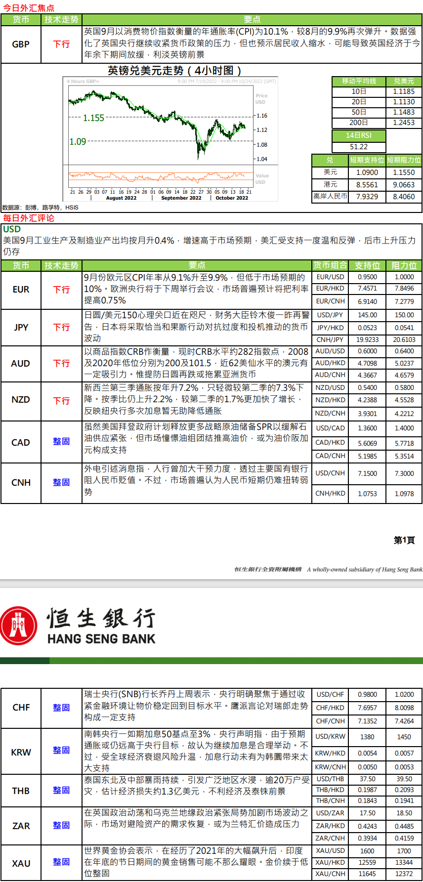 恒生银行:今日外汇黄金市场评论及操作建议(2022年10月20日)
