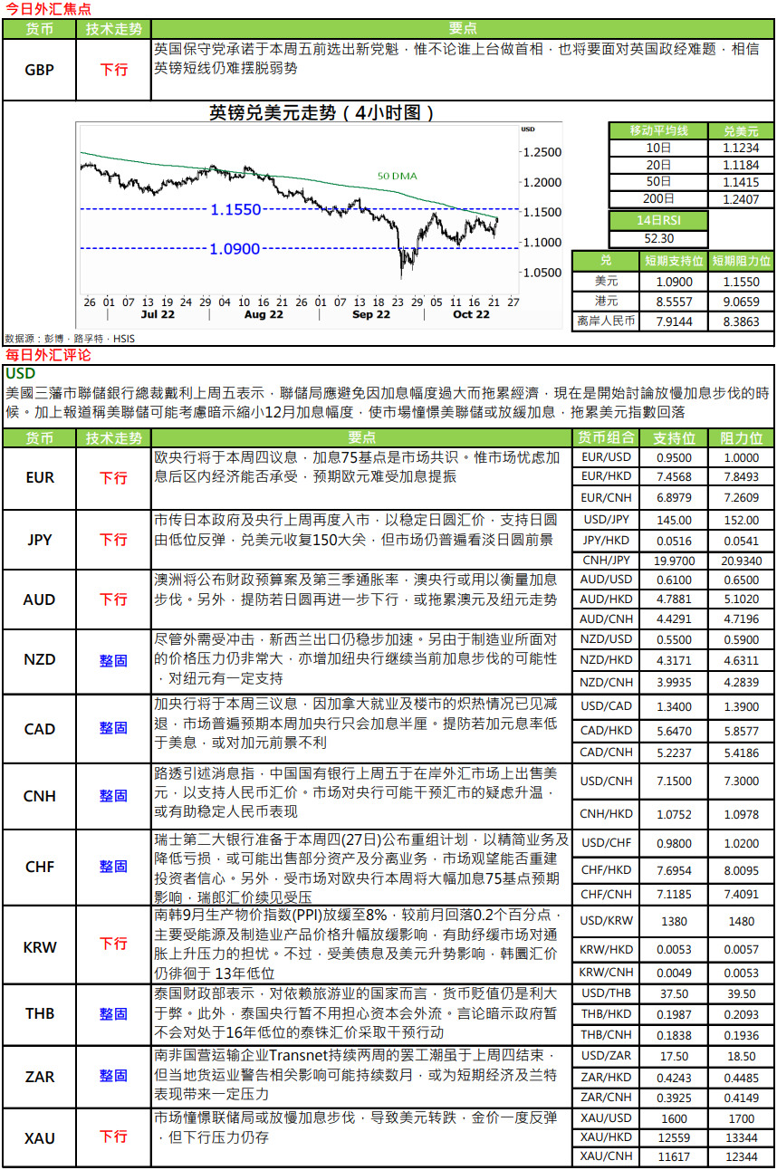 恒生银行:今日外汇黄金市场评论及操作建议(2022年10月24日)