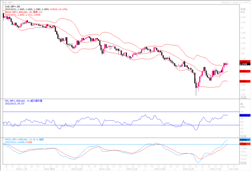 周五(10月28日)英镑兑美元上涨,延续了本周早些时候苏纳克被任命为英国两个月内的第三任首相后录得的涨幅。全日英镑上涨0.39%,报1.1609美元。分析师们现在将注意力转向本周四的英国央行会议。ING全球市场主管Chris Turner在一份报告中说:“我们认为英国央行加息50个基点的可能性比市场目前的预估概率要大--这对英镑是个利空”。也就是说本周若英国央行加息力度比市场预期减弱的话,英镑兑美元的走势恐会遭到一定抛压而走低。日图在MA100略显受阻,但回调力度有限,仍企稳MA5上方,且近期反弹势头维持完好。4小时图自1.1640一线有所回落,但力度不强,仍倾向看涨。小时图温和走低后在1.1550一线整理,维持在该档上方将有望继续走高。若跌穿,恐会重新回到颓势。