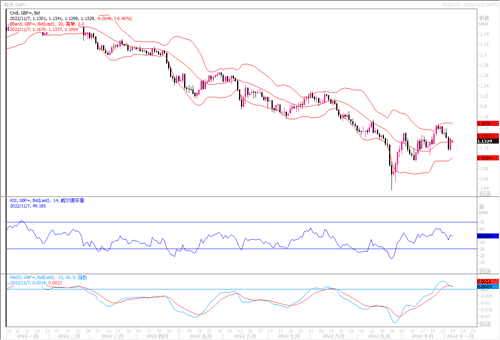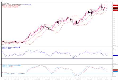 上周五英镑兑美元上涨0.63%报收于1.13之上,但周迄今下跌3.3%,为英国政府9月23日宣布迷你预算以来最大周线跌幅。本周英镑/美元的主要驱动因素是鹰派美联储和鸽派英国央行之间的鲜明对比,虽然两家央行均加息75个基点,但美联储考虑的仍是如何更激进地控制通胀,而英央行则患得患失的担忧经济是否会因加息而陷入更深的衰退漩涡中。为此,英镑兑美元上周出现大幅回落也不足为奇了。日图以大阴线跌破MA20后,周五一根阳线几乎收复了失地,但技术指标方面仍然指向下行。短线支持关注前期整理低点1.1180/70,如跌穿,则9月底以来形成的上升轨道将遭到破坏。