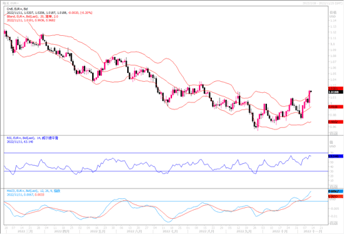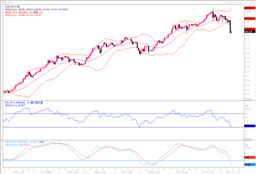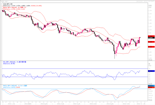 英镑兑美元周四将创下2017年1月以来的最大单日涨幅,达到3.24%高收盘于1.1723。影响的消息面主要是此前美国消费者价格涨幅度低于预期,为美联储放缓加息步伐铺平道路,CPI报告加剧了美元抛售势头。但是,周五英国国内生产总值(GDP)数据疲软的预期,以及数据显示英国10月房价在抵押贷款利率上升的情况下,市场上对于英国经济前景预期黯淡,英国央行上周警告称英国经济有可能连续两年衰退。因此,对于英镑的走势还是要保持谨慎态度。日线图上,英镑兑美元似有打破前期横盘区间倾向,但价格目前仍受压于120日均线(1.1800)下方,RSI走向均衡线上方,MACD信号线继续上扬,暂时英镑保持着多头的状态,若能冲破1.1820,上方目标区域瞄向1.20-1.22区域。下方的支撑留意1.1550-1.1500区域。