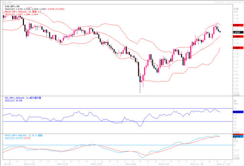 周二(12月6日),英镑兑美元连续第二个交易日下跌,收盘于1.2130。美国供应管理协会(ISM)表示,其非制造业采购经理人指数(PMI)从10月的54.4上升至上个月的56.5,表明占美国经济活动三分之二以上的服务业在利率攀升的情况下仍具有韧性。数据稍稍刺激美元指数平复近几个交易日的跌幅。而根据瑞银分析师在一份报告中说,预计英国央行将在下周的会议上将加息步伐从11月的75个基点放缓至50个基点,因中期通胀预期和劳动力需求显示出放缓迹象。由于12月就业市场报告和11月CPI数据没有出现重大意外,我们预计货币政策委员会多数成员将投票支持小幅加息。在欧美央行普遍被预期将在12月降低加息幅度的影响下,英镑对美元近期大幅走高的步伐也出现了暂时的停歇。日线图上,镑美暂时仍保持在20日均线上方,但各类技术指标由拐头下行迹象;4小时短线图上,汇价更是低落于各短期均线下方,MACD绿色动能柱开始发散。近期还是要主防英镑对美元继续回落调整的风险,下方关键的支撑在1.21-1.20区域,若失守,英镑转入下跌轨道风险增高。