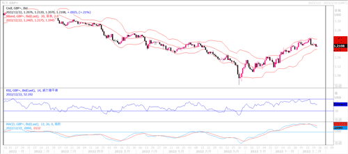 周三(12月21日),英镑兑美元下跌1.02%,报收于1.2085。在走了近三个月的升势后(升幅8.85%),英镑兑美元去到这轮升势的高点1.2447遇阻开始出现了回落苗头。英镑兑美元9月份以来的上升,很大程度上反映了其“高贝塔”地位,即恰逢全球股市上涨,投资者押注美联储正接近加息周期的临界点。而如今由于美联储和欧央行继续在加息方面保持高调,颇令英央行尴尬,在交叉盘中英镑遭到一定的抛售。因此近阶段,英镑兑美元的走势恐怕面临较为关键的抉择。日线图上英镑兑美元开始跌落各短期均线下方,各类技术指标均超下行,显示英镑下行压力加重。当前下方的重要支撑在1.20大关,若跌穿,将导致镑美跌向1.1900和10月份的高位1.1645。相反若能顽强守住1.20水平之上,则后市仍有望向高处攀爬。