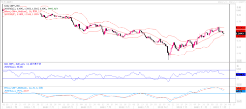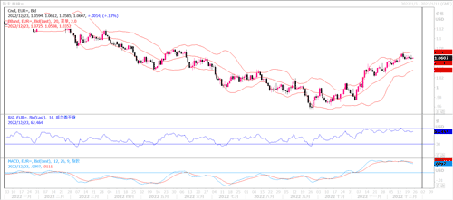 周四(12月22日),由于西方的圣诞长假来临之故,外汇市场上已提早进入节假日模式,交投几乎静止,欧元兑美元还是继续围绕着1.06水平窄幅波动,当日收盘与上日持平。来自市场方面的消息称,市场加大了对欧洲央行明年加息的押注,预计明年利率将达到3.5%的峰值。然而在周四当天出炉的数据显示,上周美国初请失业金人数增幅低于预期,表明劳动力市场仍然紧张,而第三季度GDP年化季环比终值升3.2%,市场预期升2.9%;美国第三季度核心PCE物价指数终值环比升4.7%,预期升4.6%。数据的强劲似给美联储的继续加息提供了基石。数据公布后,美国10年期国债收益率有所上升,美元指数也略有上升,但幅度有限。毕竟利率的继续调高,还是会引起对全球经济进入衰退的担忧情绪也随之升高。日线图上,欧元美元继续围绕1.06窄幅徘徊,MACD信号线似乎形成死叉,绿色动能柱开始有所发散。要留意欧元对兑美元空头的重新集结风险。一旦1.06彻底失守,下方的支撑将考验1.0545-1.0500区域。