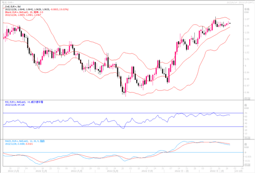 周二(12月27日)欧元兑美元上涨0.04%,至1.0640美元收盘。由于欧洲央行对通胀采取了比投资者预期的更强硬的态度,欧元近期获得支撑。此外,上周五公布的数据显示,美国11月消费者支出几乎没有增长,而通胀进一步降温,这加强了人们对美联储可能软化激进货币政策紧缩政策的预期。但是,在本年内剩下不多的几个交易日内,市况清淡毫无交投意愿。欧元兑美元在日线图上仍在近阶段的高位区域窄幅波动中,区间主要集中在1.0550-1.0700之间。只有汇价突破任何一端,方可有明晰的趋向走出来。