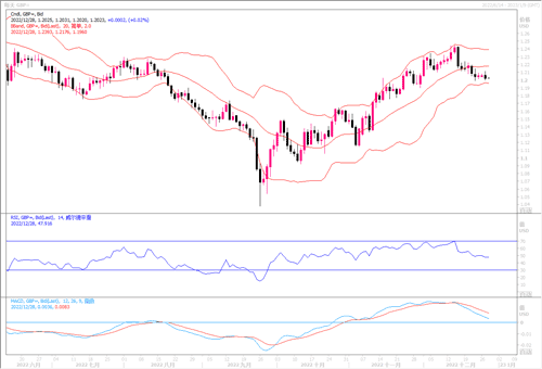 周二(12月28日)英镑兑美元跌0.29%,盘中最低跌至1.2002。英国商业咨询公司RSMUK的经济学家表示,不可否认,英国政府的紧缩措施短期内不会损害经济增长。大部分经济痛苦被推迟到下次大选之后。但这些措施在短期内不会对经济有太大帮助。该经济学家还预计,到2023年底,英国失业率将从目前的3.6上升到5左右,导致约25万人失业。随着消费者可自由支配的消费能力下降,酒店和零售行业的损失可能最大。在日线图上,自英镑兑美元跌穿20期均线以及布林带中轨后,似乎开始逐渐形成了下降通道,技术指标逐步向下延伸。当前的关键支撑在1.2000大关,若彻底失守,下方回撤目标将是1.17-1.1650区域。