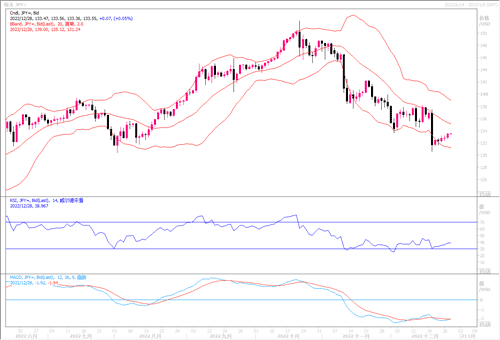周二(12月27日),美元兑日元继续上走,全日升0.46%,盘中最高触及133.59。继日本央行上周出人意料地决定调整货币政策后,日元兑美元汇率本季度上涨8.1%,迎来了自2008年以来的最大季度涨幅。但日本央行总裁黑田东彦周一否认了近期退出超宽松货币政策的可能性,尽管市场和政策制定者表示越来越关注黑田东彦明年4月任期结束后的情况。富国银行分析师表示,“虽然政策调整增加了日本央行前景的不确定性,但我们继续倾向于日本央行决策者在2023年底之前不会进一步调整政策。”“通胀压力预计会缓解,这应该会削弱日本央行采取进一步政策举措的动力。”因此,日元能否继续保持价值回归中值之路,还需密切关注日本央行在货币政策上的举动。目前无论4小时还是日线图上,美元兑日元继续展开大跌之后的反弹调整,但幅度跨得不大。因此等到技术指标修复到位,且汇价还是整理于135之下,美元兑日元后市发展大概率将还是保持延续朝下行的态势。