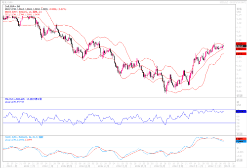 周四(12月29日),欧元对美元继续窄幅交投中上涨了0.46%,汇价最高触及1.0690,最终收盘于1.0661。周四当天,美国劳工部公布上周初请失业金人数为22.5万人基本符合预期,但是当周续请失业金人数为171万人,高于预期的168.6万人。数据不禁引起投资者对于美国经济是否会陷入衰退的疑虑。在年末市场流动性不强的情形下,往往一个数据或会令交易夸大。从技术图形上观察,10日移动均线位欧元对美元提供了支撑,水平位于1.0610 附近。然而,看跌的MACD信号和RSI的近乎超买状况有抑制了欧元的上冲动能。目前上方的1.07-1.0730区域的阻力较为关键,若冲破后,进一步的目标是5月的高点1.0786。而下方1.05的支撑一旦失守,需谨防欧元再度陷入颓势之中。