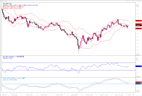 周三(1月5日)美元指数下跌,欧元兑美元上涨0.53%,收盘在1.0604,盘中最好触及1.0635。当天美国联邦储备理事会12月的会议记录没有就2月预期加息规模提供惊喜或新信息。纪要内容主要显示,美联储上个月加息50个基点,美联储官员同意放慢加息步伐,将使他们能够继续增加信贷成本,以渐进的方式控制通胀,旨在限制经济增长的风险。联邦基金利率期货交易员认为美联储2月份继续放缓加息步伐至25个基点的可能性为67%。美元的回软,暂时挽住了前个交易日大跌欧元的跌势。仅从日线图上观察,欧元兑美元汇价暂时还是徘徊于布林带中轨1.06附近,但技术指标还是未能解除向下行的趋向。若本周五美国非农数据强劲,还是要慎防欧元兑美元作进一步向下测试的走向趋势风险。