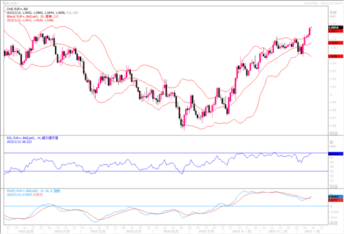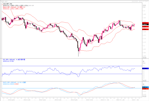 周四(1月12日)英镑兑美元上涨0.51%至1.2210,盘中曾高触1.2247。英镑昨日走升,完全拜美国12月通胀率数据继续下滑所赐,因为通胀率进一步的连续下滑,加强了投资者对于美联储将会转入平缓加息阶段的预期,为此美元出现大幅下跌,美元指数依然跌穿了近期强支撑103.00水平。日线图上,英镑兑美元汇价重回到短期均线上方,MACD技术指标重新形成金叉,RSI向超买区域延展,显示英镑多头有重新入场迹象。若近期英国方面无太大的负面消息冲击,英镑兑美元或能继续保持上行的态势。下方目前强支撑在1.2010,若镑美能保持该水平之上,后市有望攀向更高水位。