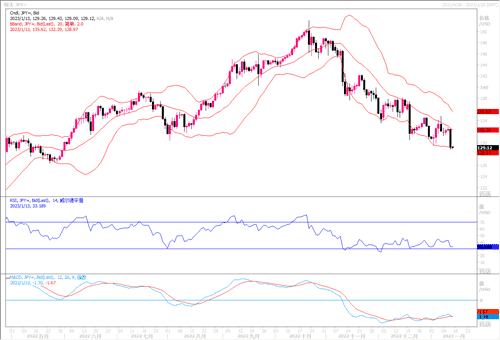 周四(1月12日)美国12月份呈继续下滑的通胀数据CPI令美元大幅下跌,美元兑日元当日跌幅触目惊心达到2.44%,盘中最低抵达128.86,创下了自上年10月份以来的最低水平。此外,《读卖新闻》报道,日本央行将在下周的政策会议上审查其货币宽松政策的副作用,并可能采取更多措施纠正收益率曲线的扭曲,这使日元也是深受提振。日线图上,虽然各类技术指标呈钝化状态,但并不能阻止美元兑日元继续下行的脚步,当前的强支撑130.00水平依然跌破,走势形态依然是处于下行通道之中。后市的交易节奏恐怕是短线整理大方向超下行这么一种走势形态,美元兑日元恐会继续朝中值120水平继续尝试挺进。