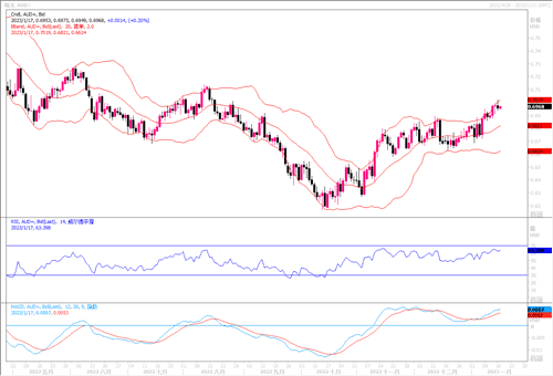 周一(1月16日)澳元镑兑美元虽略有下挫,但保持报价在0.6970近期的高点附近。澳元兑美元在过去一周左右的时间里受益于一系列基本面因素:包括国内数据、中国重新开放以及围绕美联储的鸽派情绪。从澳洲自身来说,其经济数据显示出韧性,11月份零售额环比增加1.4%,远超预期,11月份消费价格指数也小幅上升至7.3%.这些数据增强了澳联储下个月再次加息25个基点的预期,并推迟了央行可能处于暂停政策边缘的说法,从而是促使澳元保持上行的主要推手。从技术层面上来看, 一个反向的头肩顶形态似乎正在形成。若突破0.6990,接下来的前进目标将扩大至0.7050和0.7090。日线级别图上,澳元兑美元继续沿布林带上轨攀升,RSI、MACD等技术指标均向上散发,显示澳元兑美元多头动能保持控盘。短线小时图上形成W底的形态,下方的强支撑区域在0.6880-0.6920区域。