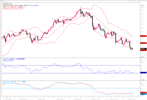 周二(1月17日)美元兑日元稍跌0.31%,收盘在128.12。自上周五美元兑日元出现大幅下跌后,本周进入了窄幅调整的交易节奏里。日本央行可能进行政策调整的预期拖累,该调整可能结束“收益率曲线控制”,成为采取更紧缩货币政策立场的前兆。在过去的几周里,这种预期推动了日元兑美元攀升。自1月6日以来,日元兑美元已经大涨了近5%。市场当前的焦点仍然是日本央行。鉴于市场已推动10年期日债收益率突破日本央行设定的0.5%的上限,且央行为扞卫这一上限而进行的购债规模开始显得不可持续,因此有关调整或结束收益率曲线控制政策的臆测升温。在本周为期两天的会议之后,日本央行预计将于周三做出关键的政策决定。“市场正焦急地等待,看看日本央行是否能在这方面有所作为。目前在日线图上,美元兑日元继续受压于各短期均线下方维持着下行态势。但各类技术指标极度超卖和钝化,应继续提高警惕,谨防美元兑日元出现大幅反弹调整的风险。下方若是继续前进,初步目标在125。相反,若调整出现的话,前阻力在135-137区域。