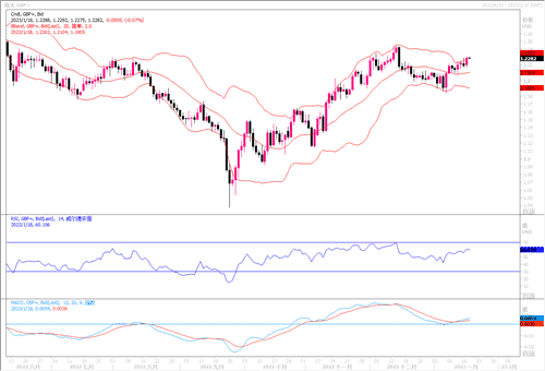 周二(1月17日)英镑兑美元飙涨0.79%,创下五周新高至1.2300水平。英国国家统计局表示,9月至11月期间,扣除奖金的平均周薪同比增长6.4%,创下自2001年开始有记录以来的最大增幅,其中不包括疫情期间封城及政府补助措施导致的异常涨幅。国家统计局表示,同时期的英国失业率保持在3.7%,符合市场预测,接近近50年来的最低水平。数据显示劳动力市场紧张、薪资增长加速,增加了英国央行对通胀的担忧,同时也提升了市场对于英央行将继续提升加息幅度的预期。这是英镑目前得到良好支撑的主要原因之一。1小时图上,英镑兑美元有超买调整的痕迹,但4小时和日线图上,镑美继续完好地位于短期均线上方,各类技术指标继续向上延展。若上方捅穿1.23水平,则前进的目标将是上年12月中旬到过的高点1.2447。下方目前在1.2100处获得较好的支撑,但跌破的话,下方进一步的支撑将是上年末密集交易区域1.2000-1.2050。