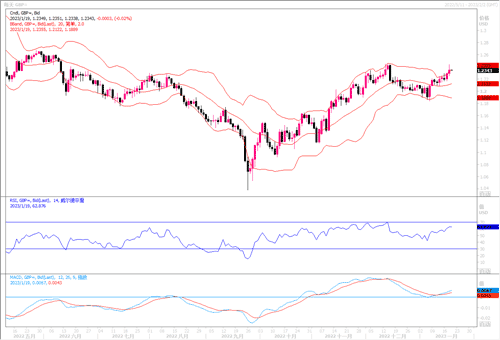 周三(1月187日)英镑兑美元英镑上涨约0.48%,收盘于1.2350,盘中最高曾触及1.2435。当日英国公布数据显示英国12月消费者物价指数(CPI)同比涨幅降至10.5%的三个月低点,但仍接近40年高位。其中服务业通胀上升以及食品和饮料价格加速上涨,让政策制定者感到有些担忧。荷兰国际集团(ING)分析师在报告中写道,“值得注意的是,服务业核心通胀率从6.4%跃升至6.8%,英国央行尤其应该考虑到这一点,再加上昨天的工资数据,应该会使央行倾向于在2月份加息50个基点。”目前市场认为,在将于2月2日举行的下一次会议上加息50个基点的可能性为82%。受该预期刺激,英镑兑美元多头近期跃跃欲试。昨日英镑已接近上个月触及的6个月高点1.2446美元,目前在日线图上维持在各短期均线上方,技术指标有开始上扬姿态;而4小时图显示有超买调整压力,下方初步支撑水平在1.2250附近(20期均线位置所在),进而在1.2160和1.2100附近。上方若能再次扫清1.24阻力障碍,目标可能瞄向上年5月份的高点1.2650附近。