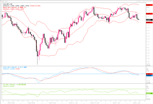 周四(2月16日)英镑兑美元下滑0.5%至1.1985美元,盘中最低曾到过1.1966。美国经济数据继续超预期逞强提振美元走强是主要影响因素外,周四当天英国方面公布英国1月通胀放缓幅度超过预期,有迹象表明,英国央行密切关注的服务业等部分经济领域的价格压力正在降温。英国央行已经暗示可能在3月停止加息,而通胀数据强化了这一观点。如此,仅在息差这一项影响因素上,就将英镑摆在了不利的一面。日线图上,英镑兑美元开始跌落各短期均线下方,汇价运行在布林带通道的下轨,各项技术指标朝下摆动,表明英镑偏于弱势。短期内,2月初到过的低位1.1961将会经受考验,若跌穿,将威胁之前大的横盘区间下沿1.18附近水平。目前在日线图上,到底是形成双顶还是双底形态,还需进一步观察。