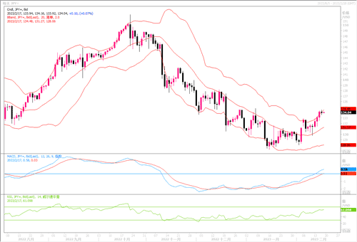 周四(2月16日)美元兑日元继续盘桓在近近阶段的高位区域134.00附近。日元隔夜受美国数据影响不大,主要是市场正在等待被提名为日本央行下一任总裁的植田和男在2月24日众议院确认听证会上的讲话。根据分析植田和男是一个务实的政策制定者型学者,他的特点是一个倾听者和共识构建者,而不是在货币政策上有强烈观点和强硬立场的人。这很难将他归类为鹰派或鸽派。他曾在去年7月发表文章表达对货币政策的意见,他反对过早加息,但也强调了在通胀加剧之际维持YCC的难度,并指出了这一政策的缺陷。因此,他上任后对于日本货币政策走向将采取何种取向,是投资者们重点关注的地方。目前,在日线图上,美元兑日元已抵近布林带上轨线,喇叭口在扩张,预示大的波动走向将会产生。现在关键在日本新任总裁植田和男的言论,若他表达鹰派,那么美元兑日元或将延续回归中值之路,为趋向125心里支撑位铺平道路。但要是鸽派,美元兑日元可能继续上涨,若汇价突破135,将进一步测试50和200日均线,甚至进一步突向138-142区域。