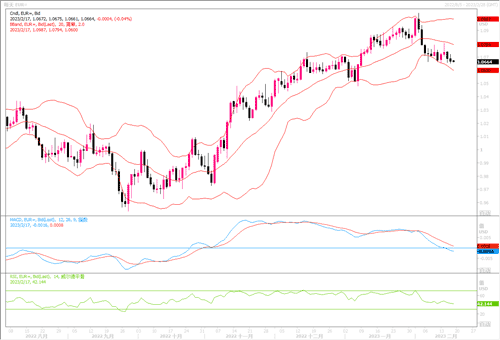 周四(2月16日)美元兑一揽子货币继续走强,欧元兑美元则承压当日下跌0.13%,低收于1.0673。在周四当天,美国公布1月PPI较前月上升0.7%,逆转12月下降0.2%的跌势。上周初请失业金人数意外降至19.4万人,相比之下,路透调查预估为20万人。随之,克利夫兰联邦储备银行总裁梅斯特发表鹰派讲话,他讲话称,美联储“在将政策从非常宽松的立场转向限制性立场方面已经取得了明显进展,但我认为还有很多工作要做”。近期连续不断公布强于预期的经济数据叠加美联储官员的鹰派表态,无疑巩固了“在更长时间内维持更高利率”的观点。这也是美元近期回强的原因所在。虽然欧央行在加息态度上也是呈激进倾向,但似乎最近的风头被美元盖住,上行受到阻滞转而走阴跌态势。日线图上,欧元兑美元已跌落各短期均线下方,技术指标也配合性的向下摆动,下走倾向性较强。近期除非欧元区有新的重大利好刺激因素出现,否则交易上还是以防范欧元继续走软的风险为主,下方关键支撑目标在1.05。