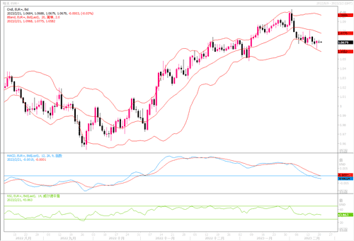 周一(2月20日)由于美国处于长周末假期中,外汇市场较为平静,欧元兑美元几乎无变化,收盘水平处在1.0686附近。据欧盟委员会的数据,欧元区2月份消费者信心指数从1月份的-20.7升至-19,符合市场预期,且该数据升至了一年来最高水平,显示出该地区经济的韧性,以及人们对于欧元区今年能够避免衰退的希望日益增强。法国兴业银行分析表示,欧洲经济衰退风险降低以及劳动力市场吃紧,应该会维持核心通胀的上行风险。因此,预计欧央行将会进一步大幅收紧货币政策。尽管如此,由于美国近期经济数据仍保持强劲,美元利率峰值预期仍在抬高,压制了欧元的反弹表现,欧元兑美元近阶段多空围绕1.07进行争夺,波动幅度缩窄。日线图上,汇价仍承压在短期均线下方,显示欧元仍未能摆脱空头的压制。预料在3月份欧美各大央行利率决议会议召开前,欧元兑美元都将维持窄幅震荡偏弱的走势格局,波动区间料主要集中在1.06-1.08之间。