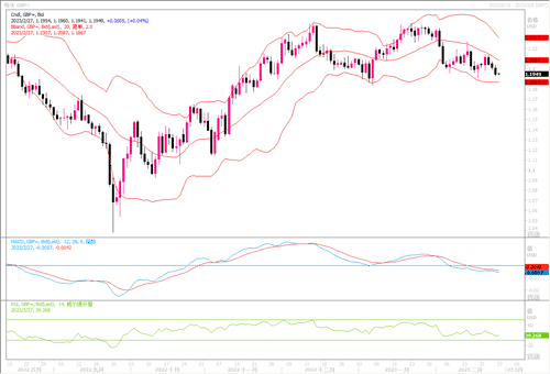 上周五(2月24日)英国公布2月份消费者信心指数大幅上升,2月份GFK消费者信心指数上升7点至-38,未2022年4月份以来的最高水平。数据提高了英国央行继续加息的预期值,一度也刺激英镑略有走高,然而在美国强劲数据的遮掩下,英镑兑美元当日最终还是下跌0.62%至1.1940收盘,盘中最低曾去抵1.1929。可以说,英镑这次在2月下跌与英国经济疲弱关系不大,更多是因为投资者认为美联储距离停止升息还有一段路要走,美联储货币变动的影响力大大遮盖了英央行的光芒,美元近期强力回弹阻挡了 英镑进一步攀高的趋向。从日线图上看,英镑兑美元继续承压短期均线下方,但未创新低,也未呈现强力下行的迹象,大局面上,仍旧挣扎在上年底至今的宽幅震荡区域内,下方的强支撑关注1.1800。英镑能不能不溃败,就看是否守得住上述支撑水平。