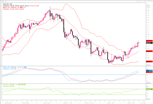 上周五(2月24日)美元兑日元继续飙升1.34%高收盘于136.49为近一个月以来的最大单日升幅。日本央行新任总裁候选人植田和男在日本国会众议院发表讲话时,对于日本货币政策并未有任何鹰派的表态,而与之相对应的是美联储的加息鹰声依旧嘹亮,这大大削弱了日元回归中值的动力,日元多头投资者似乎开始打退堂鼓。预料在近期一系列美国经济指标表现良好的背景下,美元兑日元的反弹升势将会延续。日线图上,美日汇价已渐渐企立各短期均线上方,技术指标也配合性的上扬,美元兑日元似乎在127.00水平之上筑底成功,上方若是穿破自上年10月份高点回落后38.2%斐波那契水平136.60-70水平的话,上方进一步攻击的目标将瞄向140.00关口。下方133-134区域会构成较为初步的支撑。