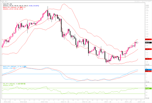 周二(2月28日)稍早,美元兑日元一度触及136.93的逾两个月高位,然后在美国数据公布后逆转了涨势。美元兑日元纽约尾盘下跌0.06%,报136.22,盘中最低曾下落至135.73。日本压低收益率的政策意味着日元对其他地方的收益率走势很敏感,不过即将上任的日本央行总裁植田和男本周表示,现在就央行可能如何调整政策发表评论还为时过早。周二他同样淡化了立即全面改革超宽松货币政策的可能性。接下来,市场关注的焦点将会放在3月份美国的就业和消费价格指数,以寻找美联储未来货币政策的方向。而美元利率的继续提升,无疑对于日元来说将是压力巨大的。短线4小时图上,美元兑日元存在超买调整的欲求,但预计调整幅度有限,且调整价位若紧守134-135区域之上,后市仍有机会攀高。进阶段对于美元兑日元的走势以防其走升的风险为主。日元逆转走强的要素尚不具备。