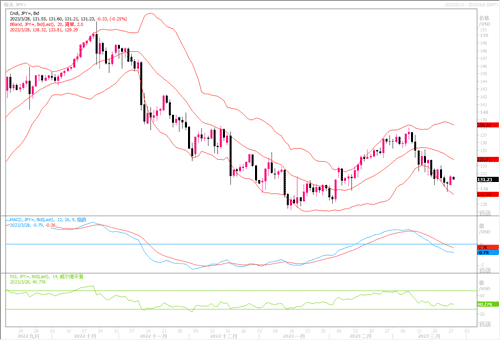 周一(3月27日)美元兑日元周一升至五日高点131.75。在联邦存款保险公司表示第一公民银行将从监管机构收购矽谷银行的所有存款和贷款后,周一市场得到一些喘息机会。美元兑日元也是收复了小部分之前几个交易日的跌幅。日线图在130一线有企稳迹象,随机指标在接近20附近整理。4小时图整体仍处于3月8日高点以来下降趋势线下方,下行趋势尚未显扭转态势。小时图短暂刺穿130后企稳震荡走高,仍缺乏上行动能。近期关注132.00一线阻力表现,若上破,则在4小时图所形成的下行通道就有可能得到破除。而下行方面,目标继续是128附近。