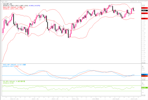 周一(6月12日)欧元兑美元持平于1.0753。投资者在本周将作出的几个关键政策决定前保持谨慎。美国5月通胀数据将在周二公布,届时美联储将开始为期两天的会议。每个人似乎都在“屏住呼吸”,等待美联储本月里的决定。根据路孚特的FedWatch工具,货币市场倾向于美联储将暂停,但大多数人预计在7月会议上将加息。相反,接受路透访查的大多数经济学家预计,通胀仍具粘性之际,欧洲央行本周将把关键利率提高25个基点,并在7月再次加息,然后在今年余下时间暂停行动。如果本周的利率会议上,美联储自2022年1月以来首次宣布保持利率不变,而欧央行则继续加息25个基点,料届时欧元或会获得机会上扬。目前日线图上,欧元兑美元略在布林带中轨线之上,MACD形成金叉,似存下回升的态势。但上方目前还是不敢尝试穿越初步的阻力1.08水平。看来一切还是要等本周四欧美央行在利率上的举动了。
