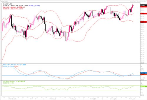 周三(6月14日)英镑兑美元当日上涨0.42%,收盘于1.2662水平,盘中最高一度接近1.27水平,创了年内新高。隔夜市场上,美联储跳过加息维持前值利率不变,刺激英镑继续走高。英国方面,英国国家统计局周三公布的数据显示,尽管制造业和建筑业出现收缩,但零售商和电影业帮助英国经济在4月一如预期增长0.2%,表明增长缓慢而不是衰退。而此前公布的就业以及薪资增长数据强劲,加深市场对英国央行今年将继续升息的预期。市场认为下周会议上加息25个基点的可能性为79%,加息50个基点的可能性为21%,并押注英国央行的指标利率(目前为4.5%)到2023年底可能最高达到5.7%。英镑利率预期继续提高,给到英镑较大的支持。英镑/美元当前完好运行在上行通道内,技术指标均呈上扬态势,预料英镑将会继续受到多头的抬捧而朝年内更高点位进发。