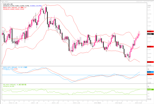 美联储当晚跳过加息,给到澳元上冲动能。而大宗商品价格走强也给澳元带来提振,而且由于对中国政府在周二调降一系列贷款利率的基础上提供更多政策支持以稳定疲弱经济的预期升温,市场情绪略有改善。美联储6月这次利率会议暂时跳过加息举动,不禁会引起市场对于其接下来的会议中会否加息产生猜测。不过在直到7月会议前这段时间内,预料澳元/美元不至于走弱。目前日线图上,澳元兑美元汇价已冲上各短期均线上方,技术指标呈强势上扬态势,虽然短线显示有超买状况,但预料回调幅度有限。若继续上行,上方目标0.69水位将不会遥远。
