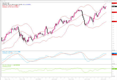 周一(8月21日),美元兑日元上涨0.55%,报收盘于146.21。经过前两个交易日的技术性获利调整后,市场似乎一来是对日本央行或会干预的防范,二来也是在寻找坚实的支撑位置。在美国和日本央行的货币政策未有大的改变场景下,套利交易模式下的多头美元交易节凑应会继续进行之中。4小时图上,美元/日元似乎在145.00水平附近获得阶段性的支撑,技术指标继续维持着上摆之态,显示美元/日元经过短暂技术性回调之后,趁低抄入盘仍旧支撑着美元的走高。而日线图上,中短均线均支撑着汇价走高,显示美元多头处于绝对优势之中。预料美元/日元将会不断被测试高点以及日本央行的容忍警戒水平。
