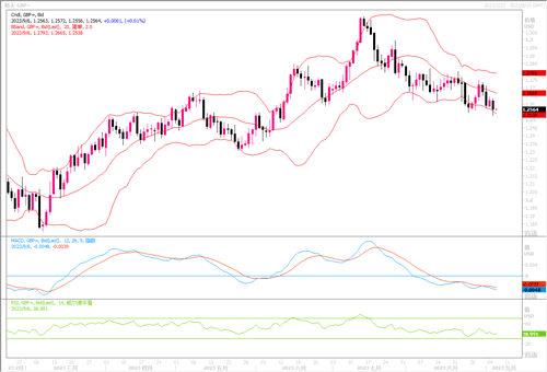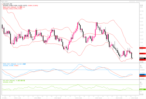周二(9月5日),澳元兑美元是表现最疲软的货币对之一,一度下跌1.29%,触及10个月新低0.6357,最终收盘于0.6379。澳洲央行周二连续第三个月维持利率4.1%。不变,这令市场猜测紧缩周期已经结束,决策者们表示他们对物价的控制更加有力。澳洲央行的政策立场总体上仍对澳元构成压力,尤其是兑美元方面,因为在2024年之前,美国联邦基金利率似乎极有可能比澳洲央行的隔夜拆款利率高出125个基点以上。息差上的劣势,继续令澳元遭受重击。日线图上,澳元/美元跌落至布林带通道下轨,且一周前的强支撑0.64亦失守,澳元/美元保持着弱势的走势形态,下方若继续下行,将会探测去年10月份到过的低位区域0.62附近。上方只有回到0.66之上,或才能有望扭转或稳住下滑的势头。